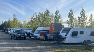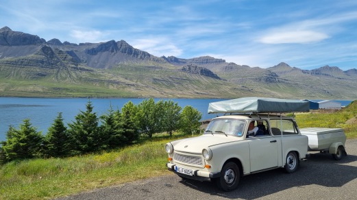 Dann ging es zurück nach Egilsstaðir auf den Campingplatz und hier gab es auch das lang ersehnte Eis, dass wir uns nach dem Aufstieg verdient hatten. Außerdem trafen wir hier Stefan und Sigur vom Vortag wieder. Sofort waren wir wieder im Gespräch und nachdem sie mit ihrem Nachbarcamper (Isländer) gesprochen hatten, parkten wir unseren Trabi etwas windgeschützt zwischen den beiden Wohnwagen. Sie luden uns dann zu sich in den Wohnwagen zum Essen ein und wir hatten einen wundervollen Abend mit tollen Gesprächen und leckerem Essen.