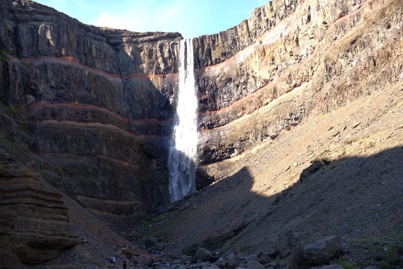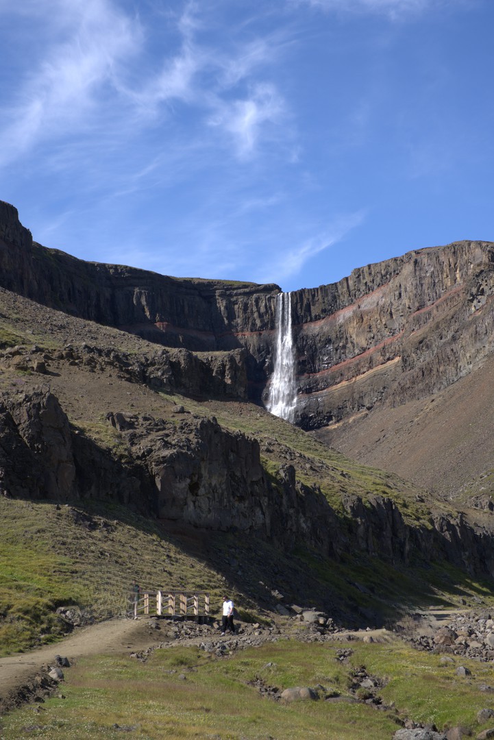 Unser Ziel, den Hengifoss, sahen wir schon vom Weitem, denn er lag recht hoch oben in einem Berghang. So parkten wir den Trabi und stiegen die rund 350 Höhenmeter zum Wasserfall. Ein anstrengender Weg, der sich aber absolut gelohnt hat. Denn nicht nur der Hengifoss, der durch seine roten Streifen im Fels eine besondere Kulisse schafft, auch der etwas weiter unten liegende Litlanesfoss mit seinen Basaltsäulen wurde von einem isländischen Dichter und Naturforscher Jónas Hallgrimsson 1842 als „Steinernes Schloss“ bezeichnet.