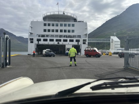 Um 7:00 Uhr sind wir vom Campingplatz losgefahren, denn wir wollten die lange Steigung zum Pass über den Fjarðarheiði Pass, der gut 600 Meter hoch ist, meistern, ohne dass wir eine lange Autoschlange hinter uns herzogen. Der Trabi hat die rund 8 km Steigung im 2. Gang dann aber anstandslos absolviert, so dass wir um 7:40 Uhr in Seyðisfjörður eintrafen und ohne Probleme eingecheckt haben. Pünktlich um 12:30 Uhr lief die Norörra mit uns aus. Wir sind auf Island in Summe 2457 km gefahren.